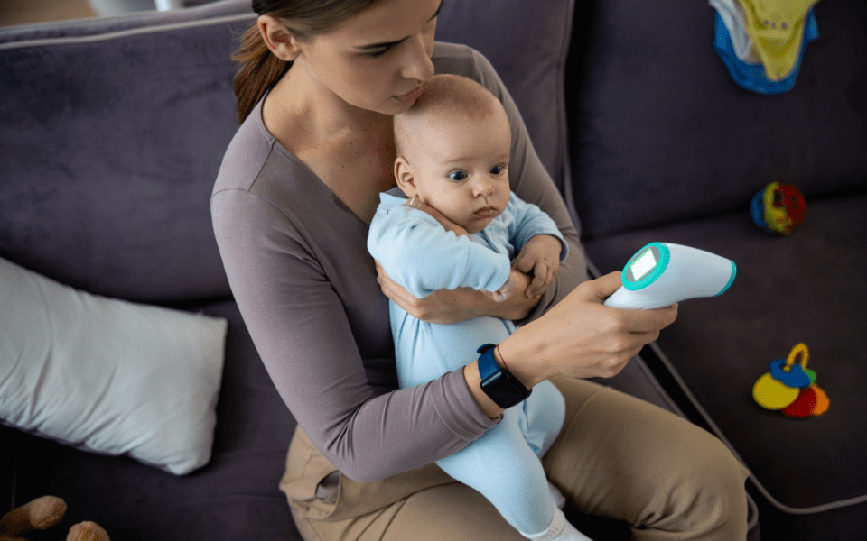 It's important you get an accurate temperature reading, so have a rectal thermometer at home. They are the most accurate and essential when taking a baby's temperature. Rectal thermometers are easy to use, and your baby won't feel a thing. Simply cover the end of the thermometer in petroleum jelly and insert it about one inch.