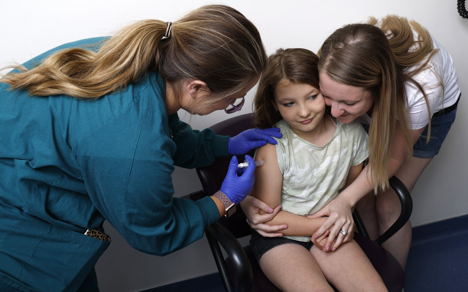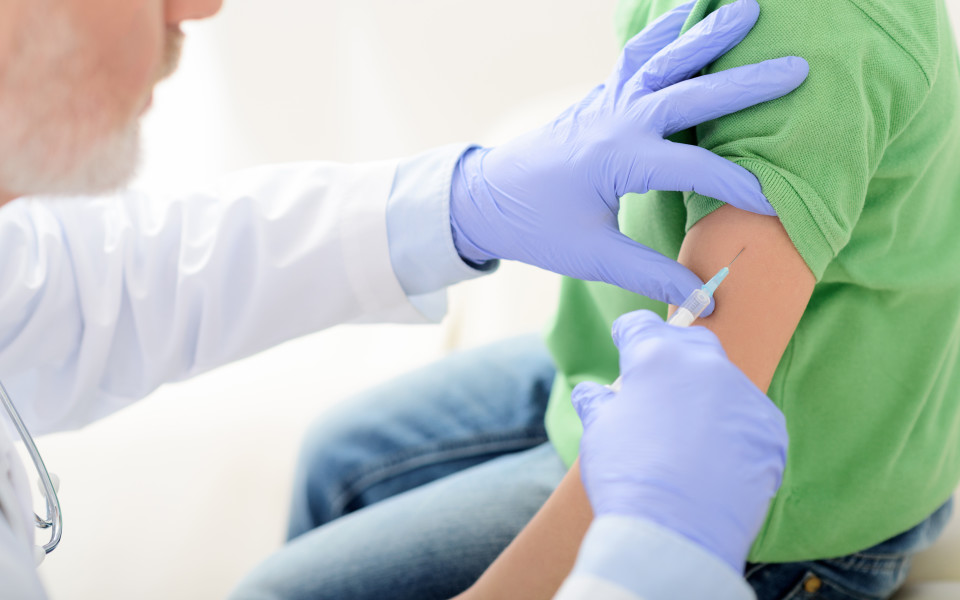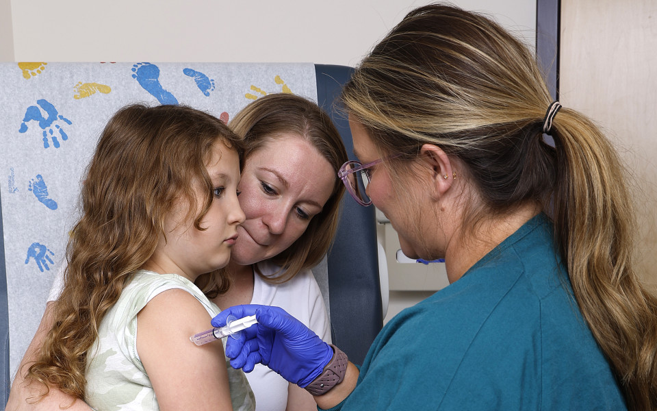 Hug your child firmly and offer distraction on the opposite side of the injection