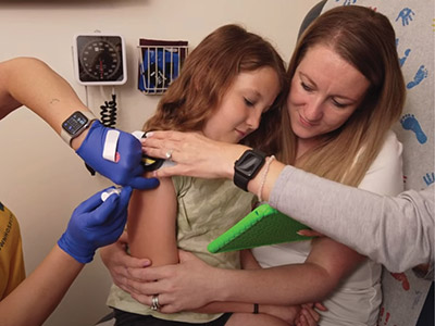 If your child is getting the injection in their leg, you can use both arms to give a supportive hug and even hold their hands