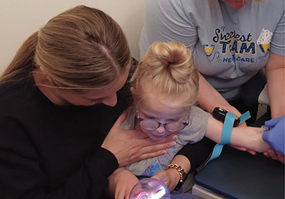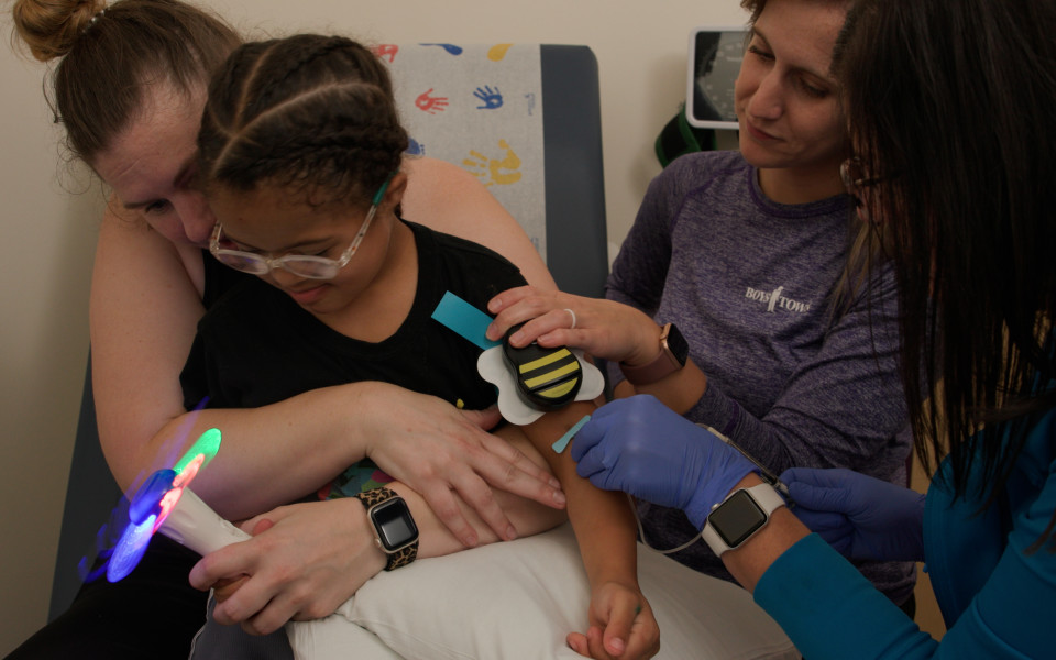Studies have shown that children report feeling less pain during needle procedures when they're allowed to sit up or be held by their parent or caregiver. Boys Town Child Life recommends the following comfort positions for lab draws, with some minor modifications to account for your child's size.