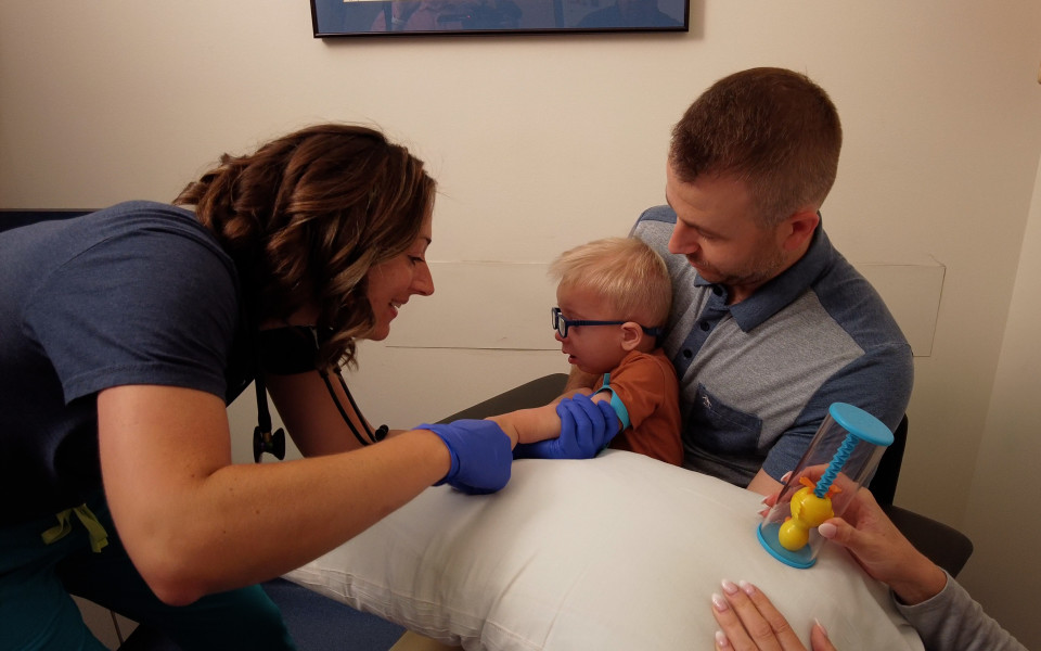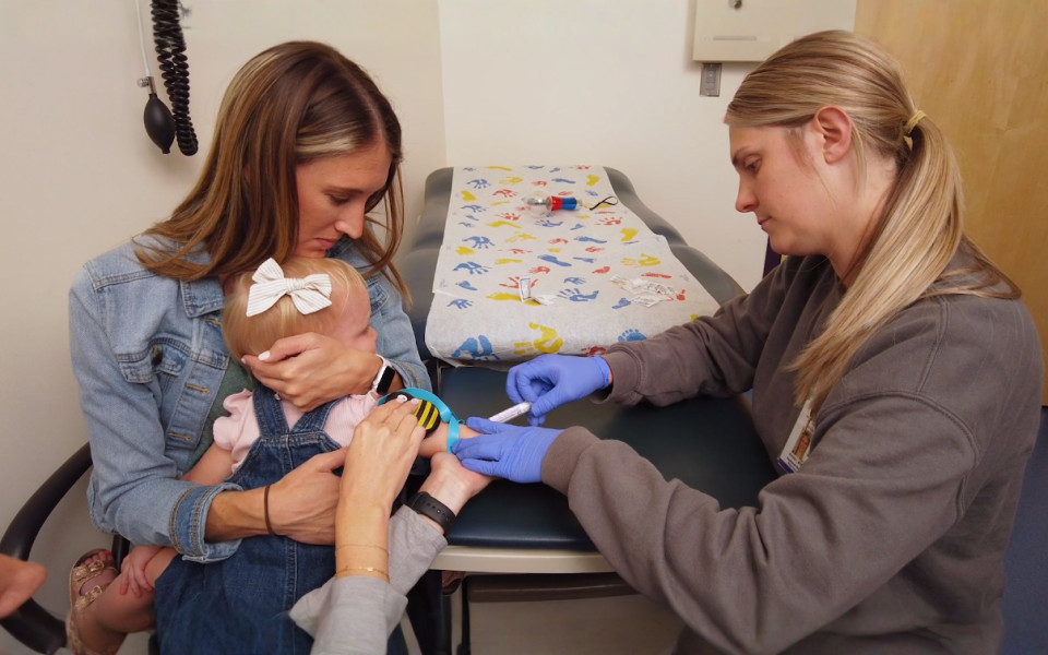 Little ones are often easier to contain during moments of tension or stress. It's important to talk calmly to your child during the hold and procedure. Pacifiers have been studied and recommended for pain relief for infants having minor procedures like a blood draw. Many doctors' offices also have a sucrose (sugar) solution available to address additional pain relief for infants, so please feel free to ask.
