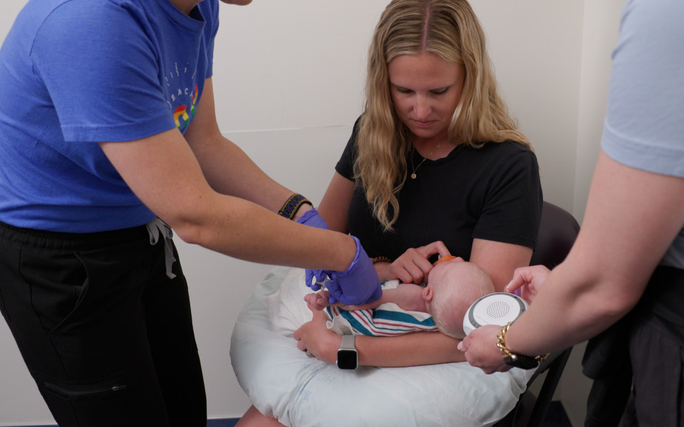 Little ones are often easier to contain during moments of tension or stress. It's important to talk calmly to your child during the hold and procedure. Pacifiers have been studied and recommended for pain relief for infants having minor procedures like a blood draw. Many doctors' offices also have a sucrose (sugar) solution available to address additional pain relief for infants, so please feel free to ask.