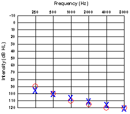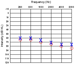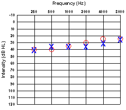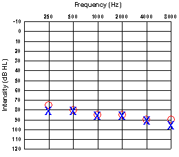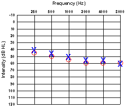 The charts below depict examples of audiograms for different hearing loss levels. The red circles represent the right ear’s hearing and the blue X marks represent the left ear’s hearing.
